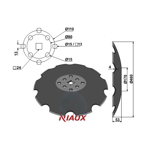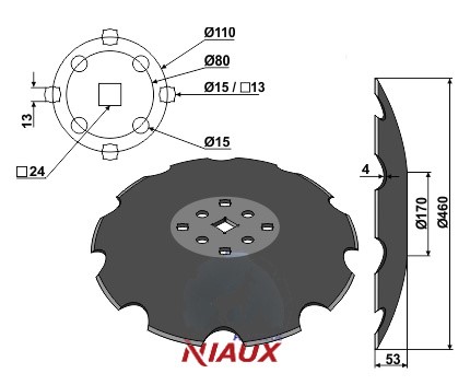 D:460 S:4 F:53 Ilość zębów:10 Średnica koła otworów - 1:O80 Średnica koła otworów - 2:O110