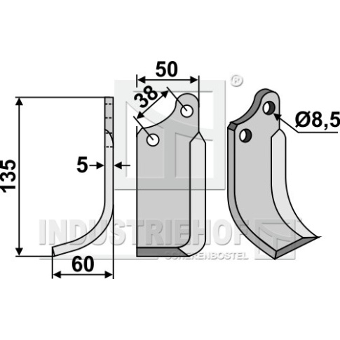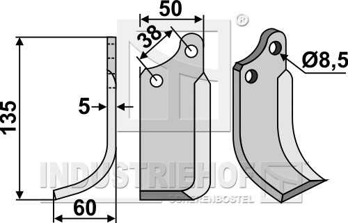 Grubość:5 Długość:135 Odstęp pomiędzy otworami:38 Szerokość:50 Otwór:8,5