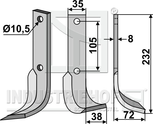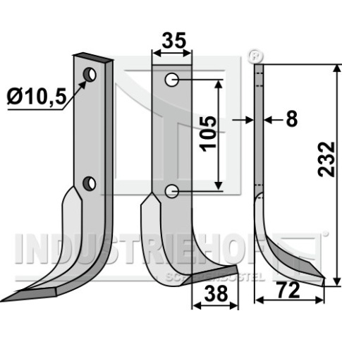 Grubość:8 Długość:232 Odstęp pomiędzy otworami:105 Szerokość:35 Otwór:10,5