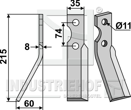 Grubość:8 Długość:215 Odstęp pomiędzy otworami:74 Szerokość:35 Otwór:11