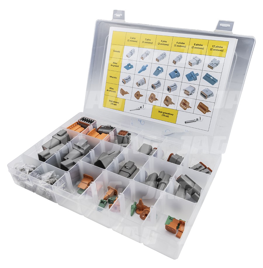 Zestaw złączek Deutsch DT: - dwa komplety złączek każdego typu: 2-piny, 3-piny, 4-piny, 6-pinów, 8-pinów oraz 12-pinów, - łącznie 188 elementów.